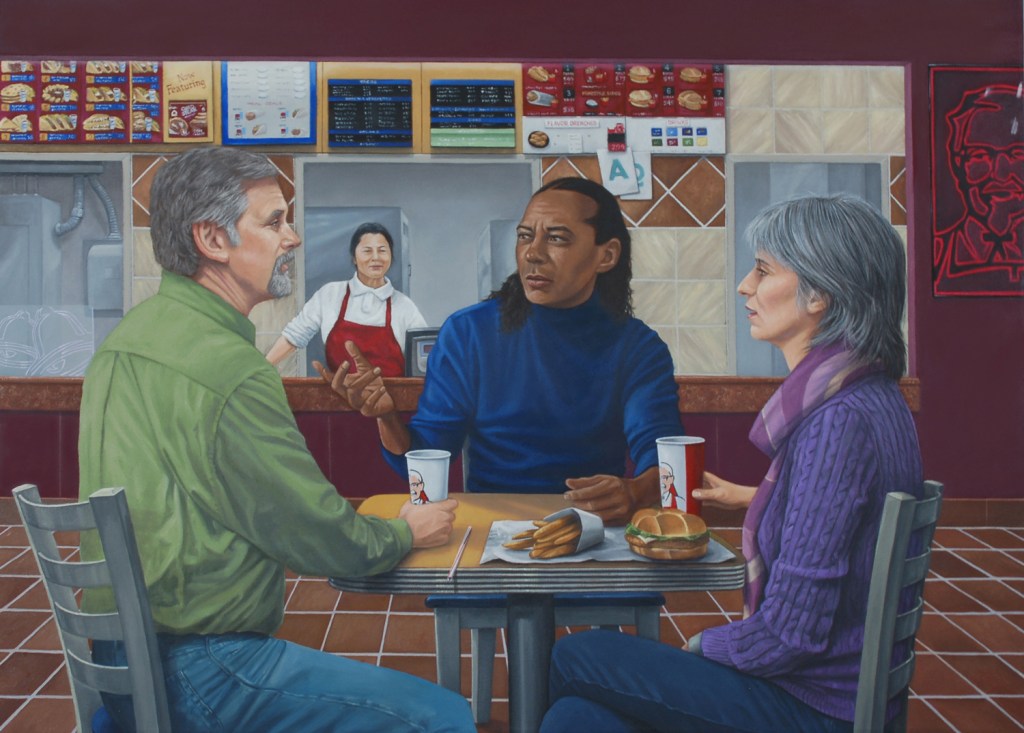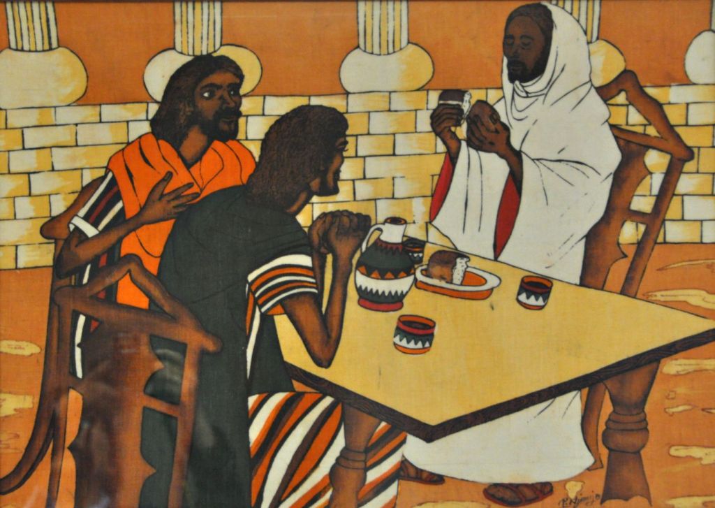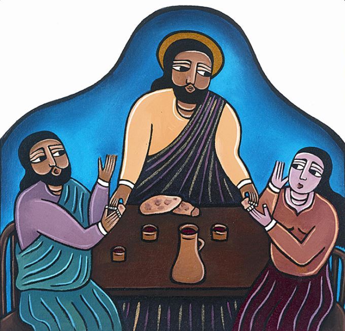 Here are two contemporary American paintings.  First by Laura James: “Emmaus Story”.  The second by Barry Motes: “Supper at Emmaus”.