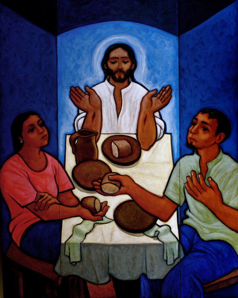 Maximino Cerezo Barredo (Spanish, 1932–), “Emmaus” (triptych), 2014. Carvalhos, Portugal. Photo courtesy of the artist. https://www.facebook.com/parroquiatavernesblanques/photos/a.820846058005134/1681872961902435/?type=3&theater