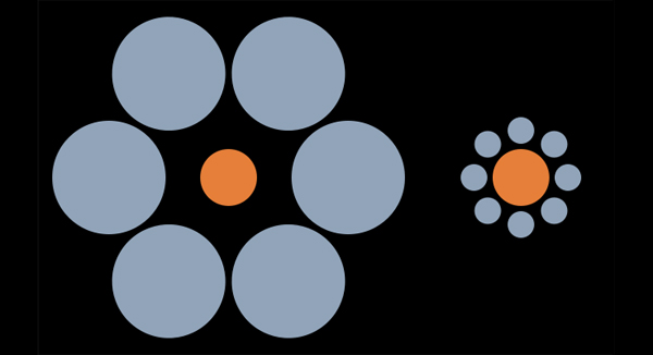 You have probably seen this before, or something like it:  a simple question with an obvious, but wrong, answer.  The reality is both orange circles are the same size.  They appear to us as one smaller, one larger.  But why?  The blue circles around the orange circles, the distracting context throws our judgement off, keeps us from seeing the reality.